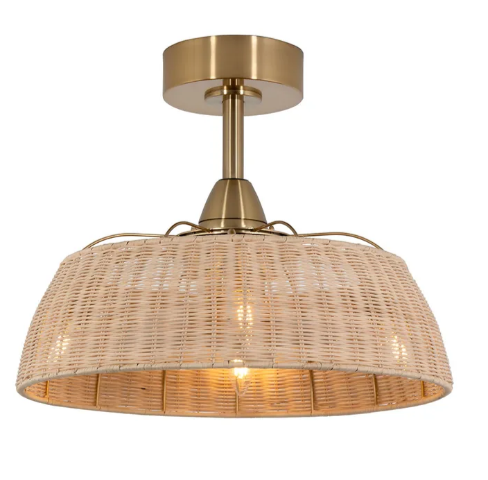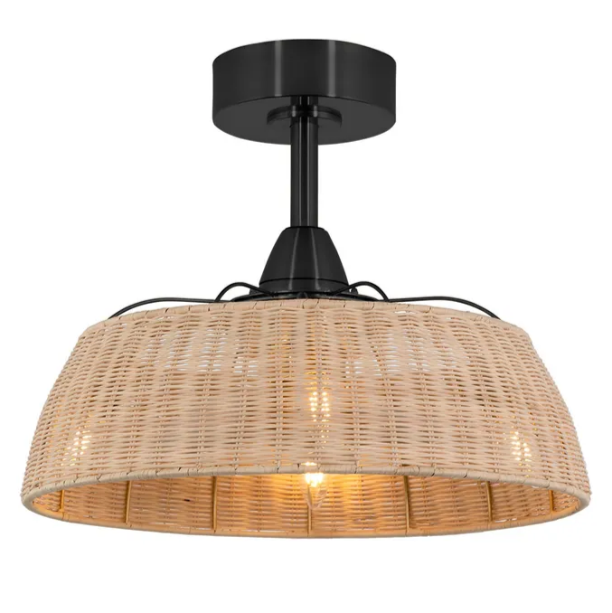 The new Harlow ceiling fan features a woven rattan shade that is attached to a black metal frame. The shade is woven in a tight, intricate pattern. The metal frame is simple and elegant. The Harlow is also well-suited for a modern or contemporary home and would add a touch of natural elegance to any room.